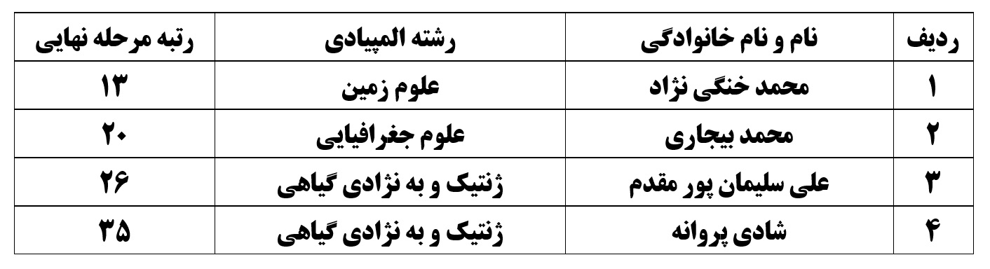 براین اساس، محمدخنگی در رشته علوم رزمین رتبه 13 و محمد بیجاری در رشته علوم جغرافیایی رتبه 20 و علی سلیمان پور مقدم در رشته ژنتیک و به نژادی گیاهی رتبه 26 و شادی پروانه در رشته ژنتیک و به نژادی گیاهی رتبه 35 را کسب کردند.