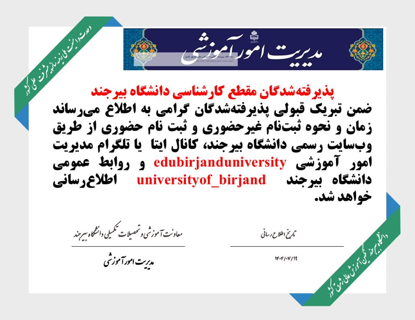 اطلاعیه درخصوص پذیرفته شدگان مقطع کارشناسی دانشگاه بیرجند