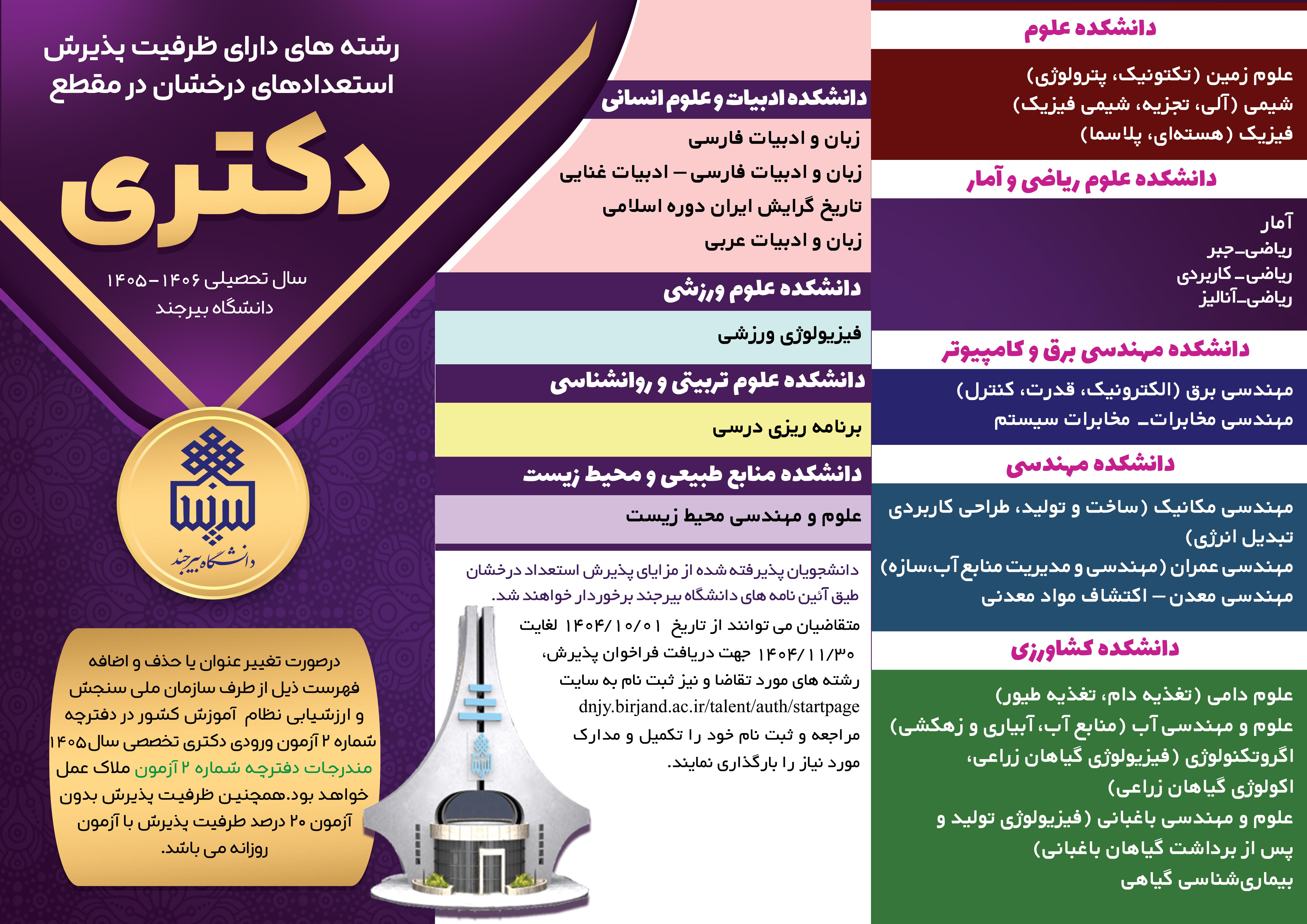 اعلام رشته‌های دارای ظرفیت پذیرش استعدادهای درخشان مقاطع کارشناسی ارشد و دکتری دانشگاه بیرجند برای سال تحصیلی 1405-1406