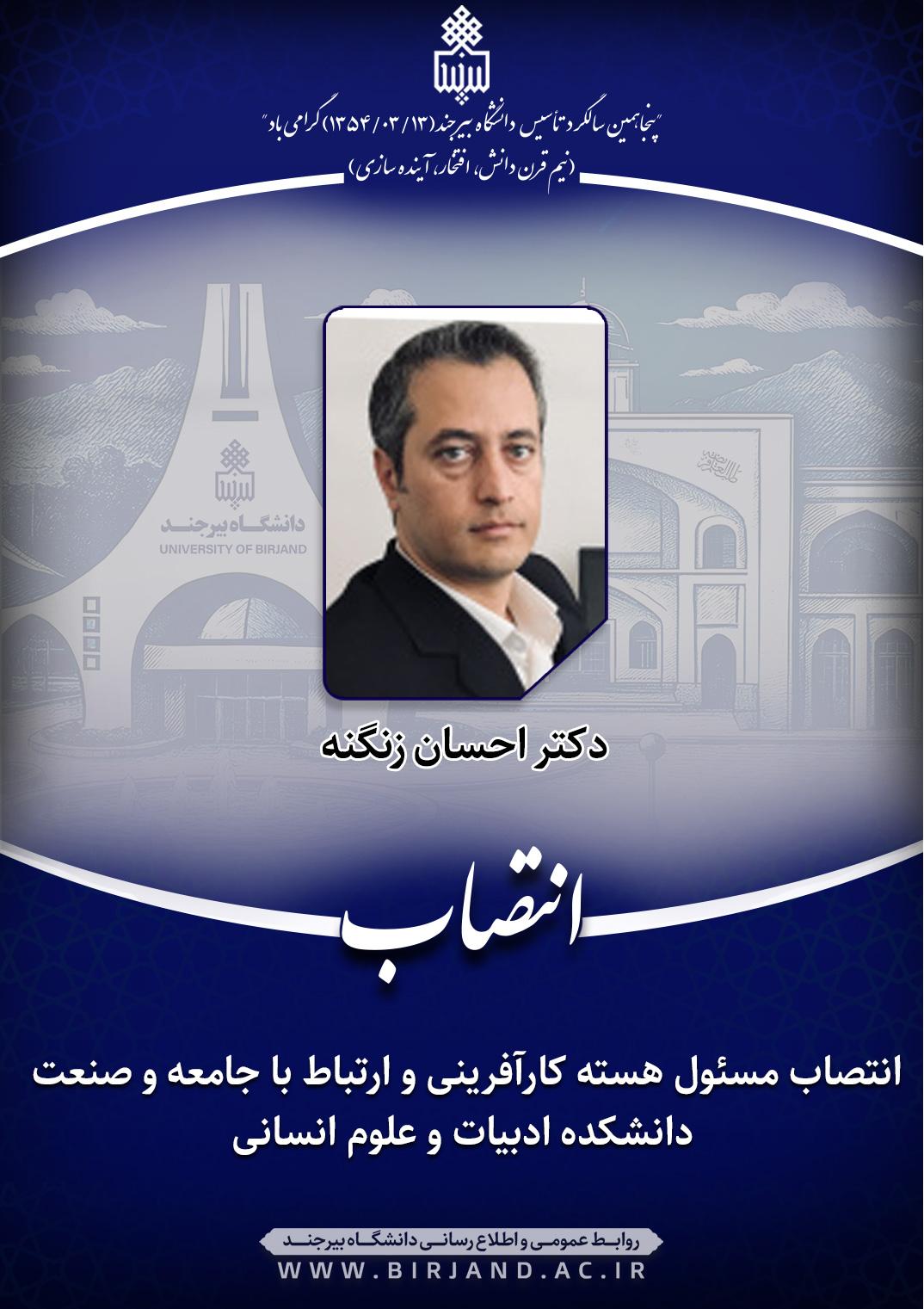 به گزارش روابط عمومی و اطلاع‌رسانی دانشگاه بیرجند، در این ابلاغ انتصاب آمده است؛ نظر به تعهد، تخصص و شایستگی‌های علمی و اجرایی جنابعالی و با عنایت به ضرورت توسعه فعالیت‌های کارآفرینی و تعمیق ارتباط دانشکده‌ها و پردیس‌های دانشگاه با جامعه و صنعت، بدین‌وسیله به موجب این حکم، به مدت دو سال به‌عنوان «مسئول هسته کارآفرینی و ارتباط با جامعه و صنعت دانشکده ادبیات و علوم انسانی» منصوب می‌شوید.